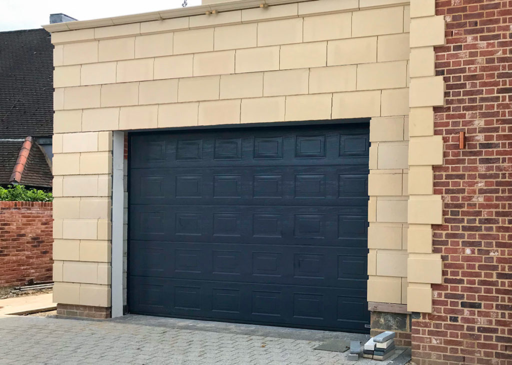 A Hormann LPU42 S-Panelled Sectional Garage Door finished in Steel Blue