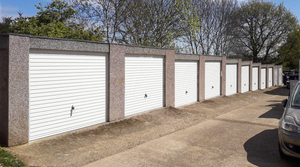 A Row of 9 Hormann 2002 Horizontal Steel Up & Over Garage Doors in White