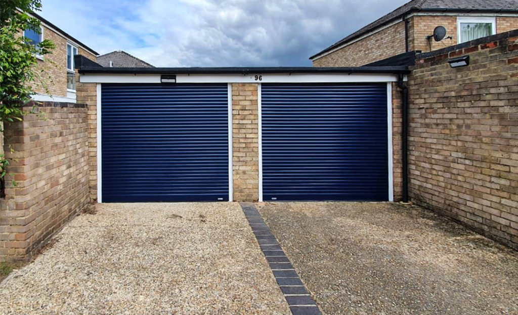 2x SeceuroGlide Compact Insulated Roller Garage Door finished In Navy Blue & Installed By Our Croydon Branch.