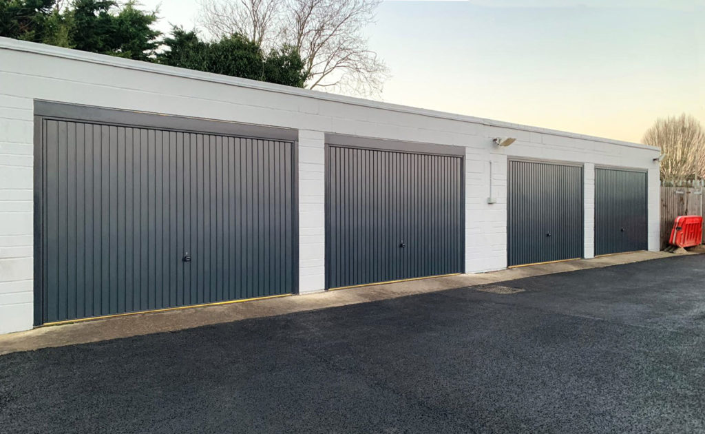 A row of 4x Garador Carlton Vertically Ribbed Canopy Up & Over Garage Doors Finished in Anthracite Grey, Installed in Southend by our Upminster Branch.