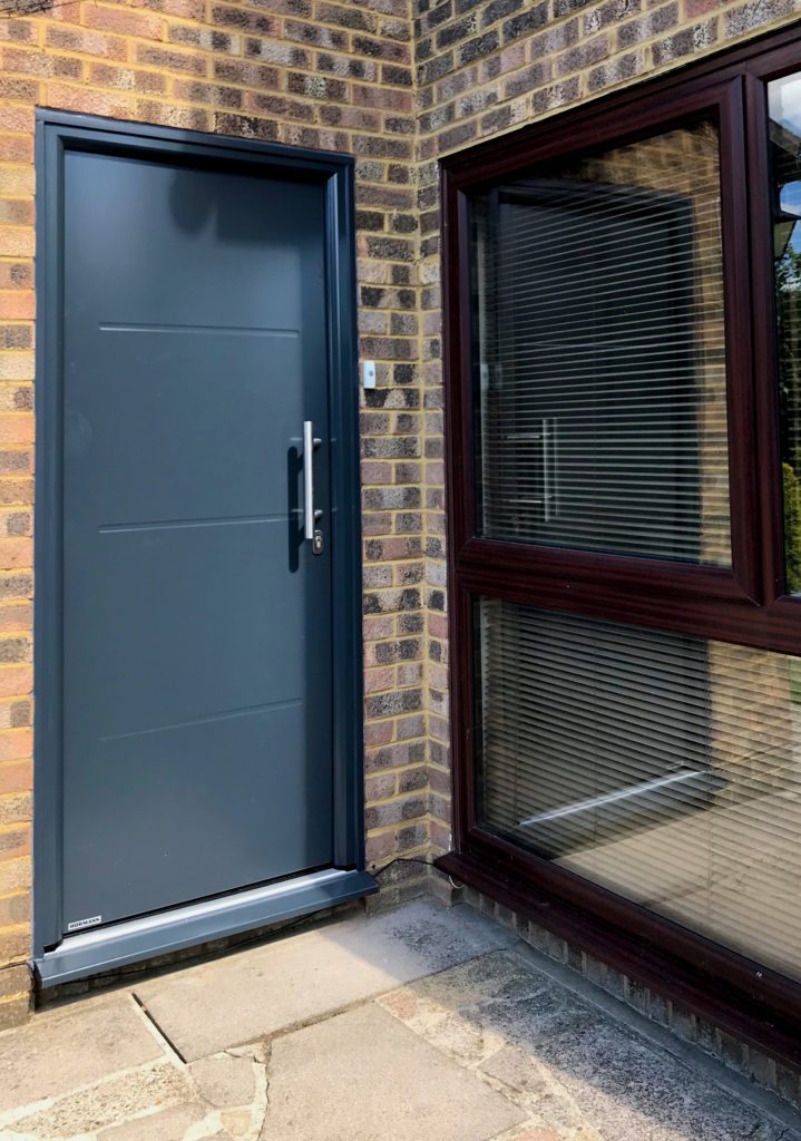 A Hormann Thermo46 TPS515 Entrance Door in Anthracite. It was installed by our Croydon Branch in Crawley.