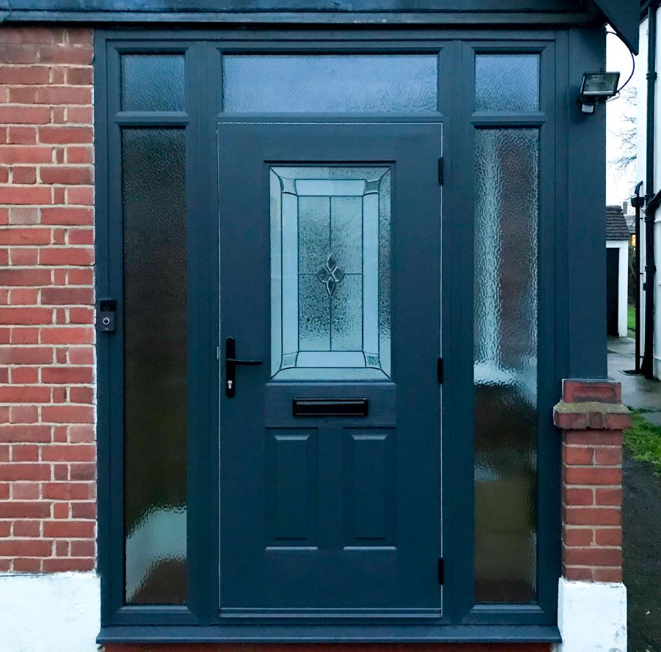 A RockDoor Ultimate Windsor Front Door fitted with Side Lights, Transom & Quarter Lights. Complete with PVC Cladding in Wembley by our Watford Branch!