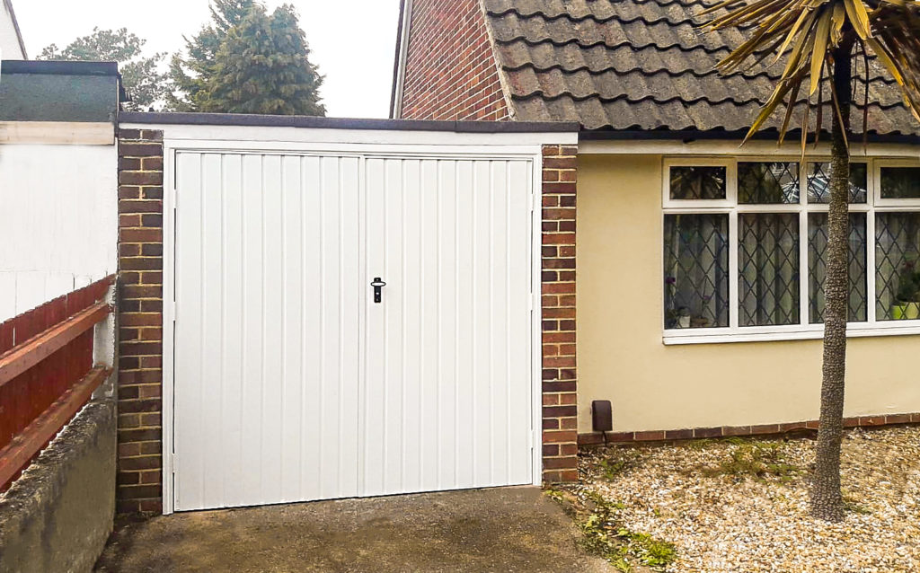 Fort Doors Vertical Small Rib Steel Side Hinged Garage Door in White, installed in Morden by our New Malden branch.