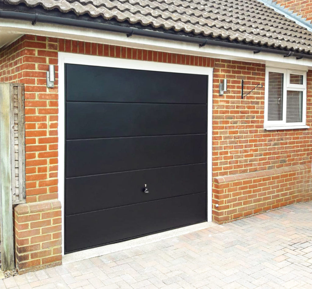 Garador Ascot Wide Horizontally Ribbed Canopy Up & Over Garage Door Finished in Black & Installed in Walton on Thames By Our New Malden branch.
