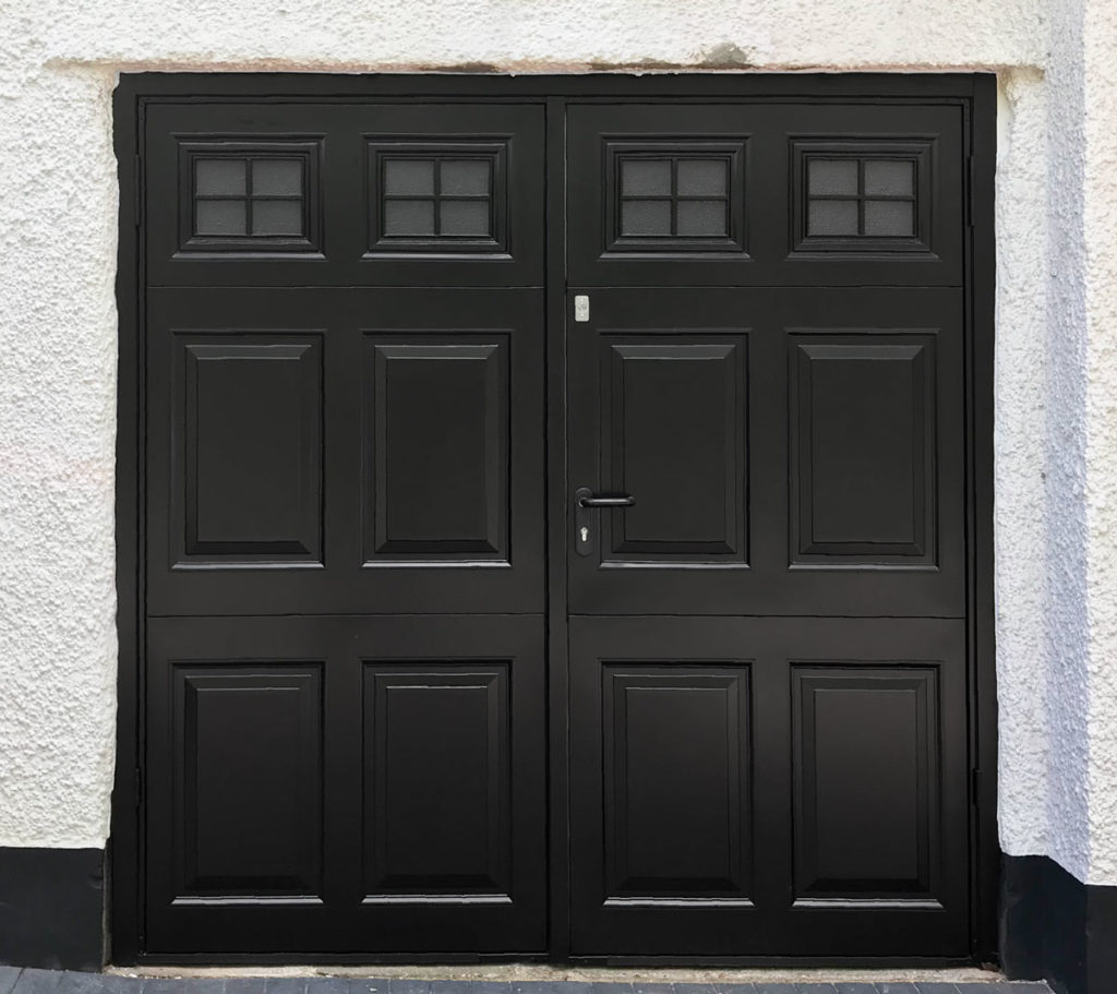 A Garador Beaumont Steel Framed Side-Hinged Garage Door in Black, complete with automation. It features side-hinged conversion arms (For the Operator) whilst also using an external release device as it has no secondary access. This installation was fitted by our Watford Branch.