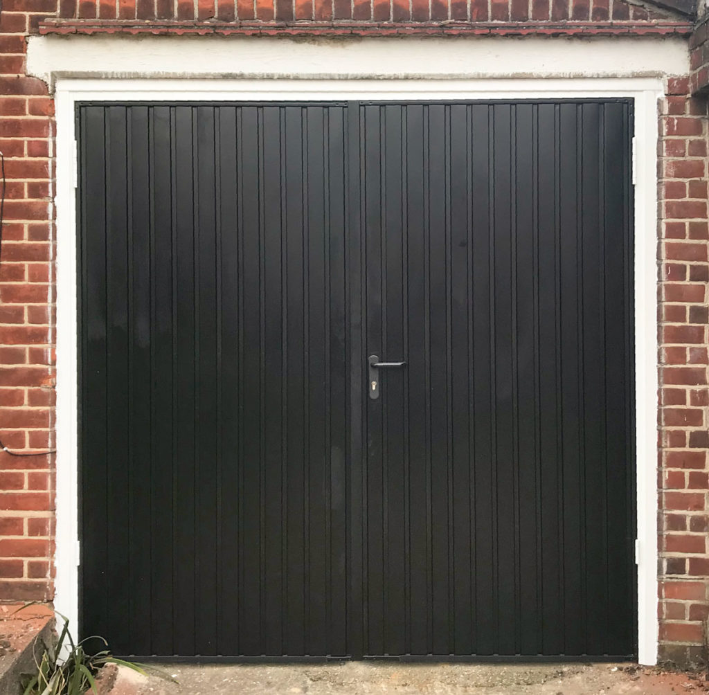 A close-up of the Garador Carlton, Steel Framed, Side-Hinged Garage Door fitted last week! Finished in RAL9005 Jet Black, it was installed with white PVC cladding in Stanmore by our Watford Branch.