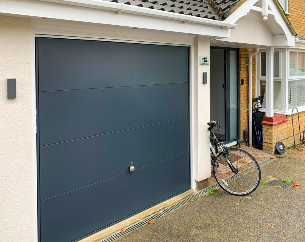 Garador Design 100 Wide Ribbed Steel Canopy Up & Over Garage Door Finished in Anthracite Grey & Installed By Our Watford Branch.