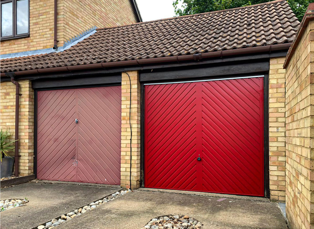 Garador Steel Chevron Canopy Up & Over Garage Door Finished in Ruby Red & Installed in Walton-on-Themes By Our New Malden Branch.