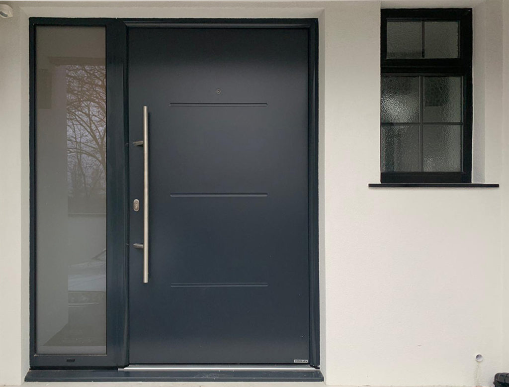 Our customer was looking for a front door with a side element which would have excellent insulation properties whilst also providing security and peace of mind. The preference was a door with a minimal design door and finished in a darker solid colour to match the elements of the property.