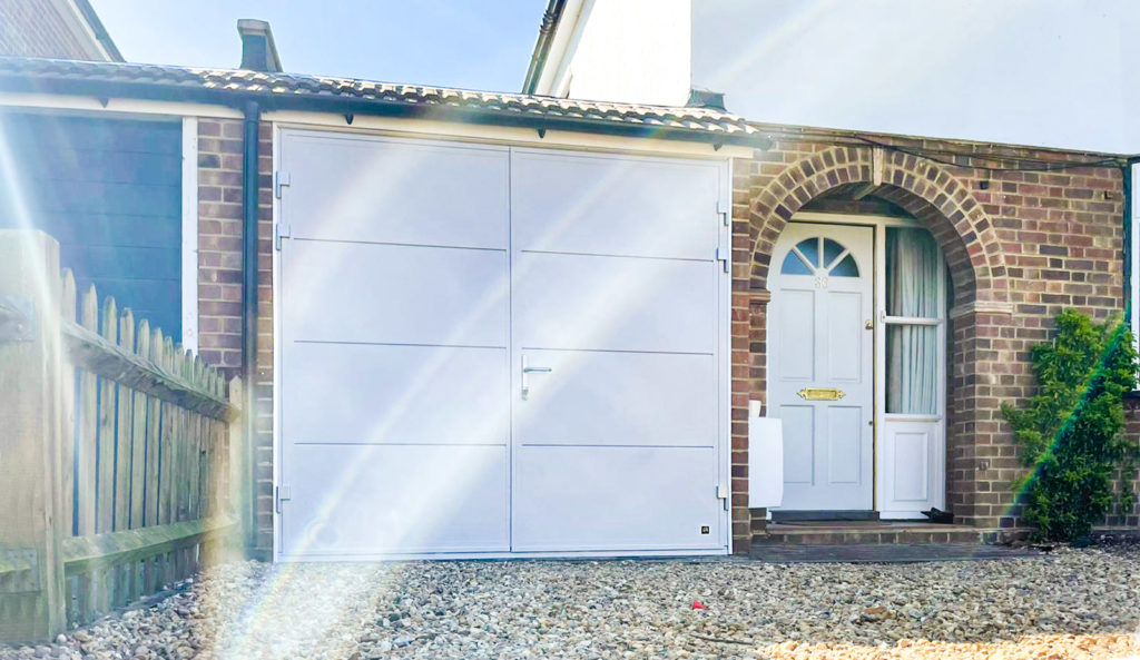 Ryterna Wide Horizontal Ribbed Insulated Side Hinged Garage Doors Finished in Custom Telegrey (RAL 7047) Colour. Installed in Thames Ditton by Our New Malden Branch.