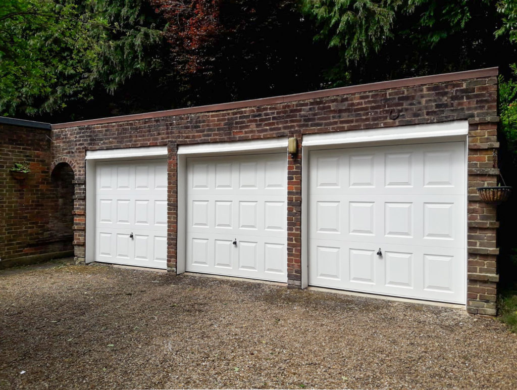 A trio of Garador Georgian Retractable Up-and-Over garage doors in white with matching steel frames, installed in Hill Close by our New Malden branch. Installed behind the openings to gain the maximum drive through width, with Retractable Plus lifting gear and two point locking as standard.