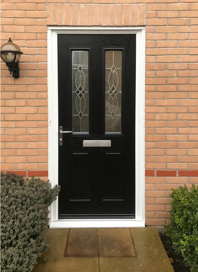 This Truedor Entrance Door came installed with the flair decorative glazing element with black coloured diamonds within the glazing itself. The entrance door also features a chrome lever door handle & matching letter plate.