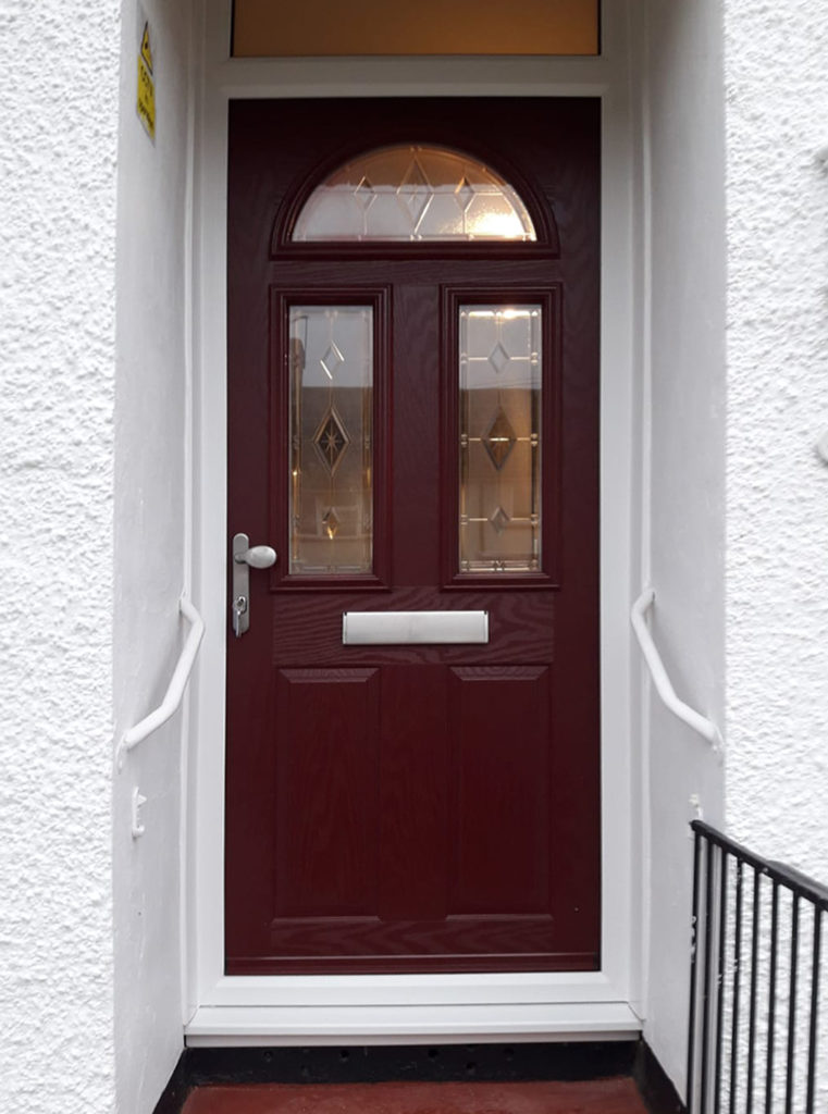 This Truedor TR1F composite entrance door was finished in wine red externally and includes a harmony traditional crystal bevelled design on the door itself. The door also features a brushed chrome lever pad handle set.